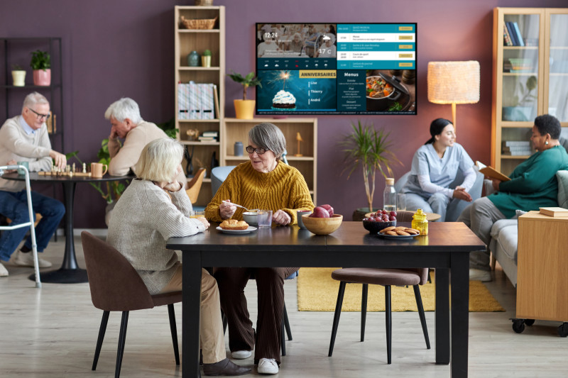Les écrans d’affichage dynamique peuvent être programmés à l’avance, en fonction des événements que vous souhaitez annoncer. Les contenus sont adaptés afin de pallier les défaillances visuelles. C’est aussi l’occasion d’activer la mémoire des résidents en diffusant des diaporamas photos des derniers moments festifs. Les écrans peuvent être de différentes tailles (de 32 à 85 pouces), avec une luminosité adaptée à l’éclairage ambiant. Ils s’éteignent automatiquement la nuit pour favoriser les économies d’énergie.